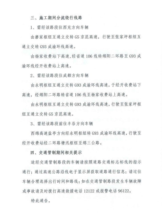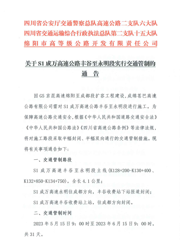 關(guān)于S1成萬高速公路豐谷至永明段實(shí)行交通管制的通告