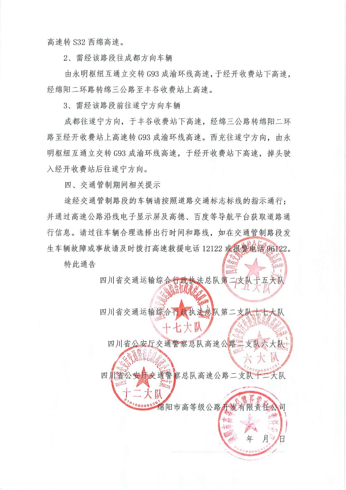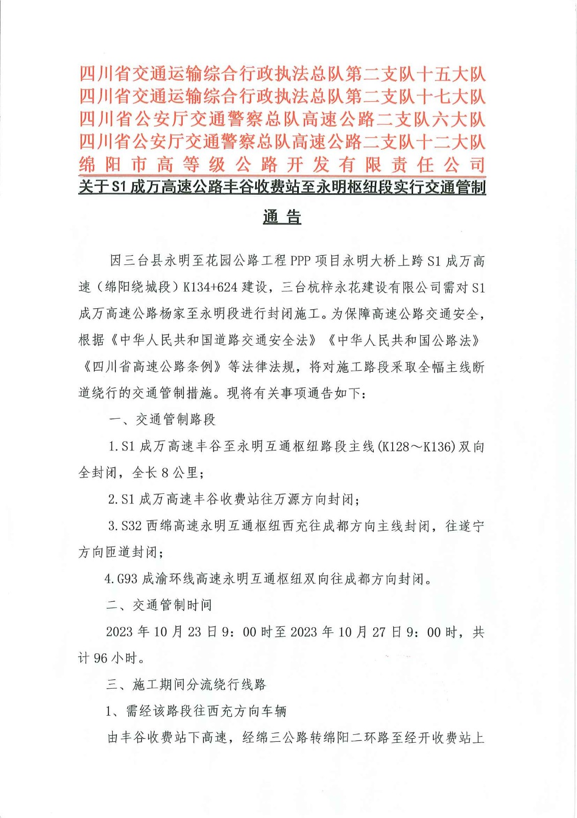 關于S1成萬高速公路豐谷收費站至永明樞紐段實行交通管制通告