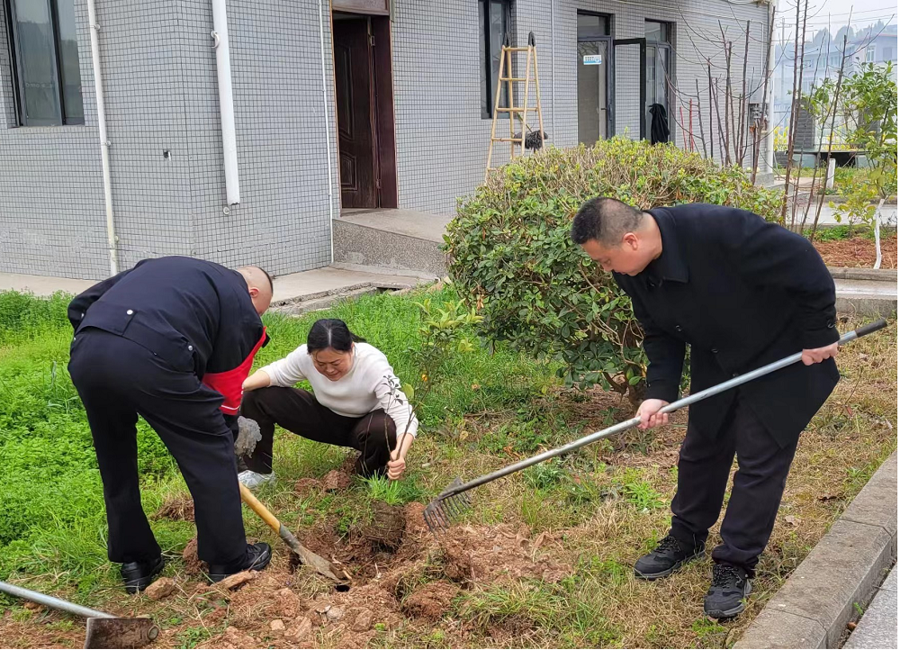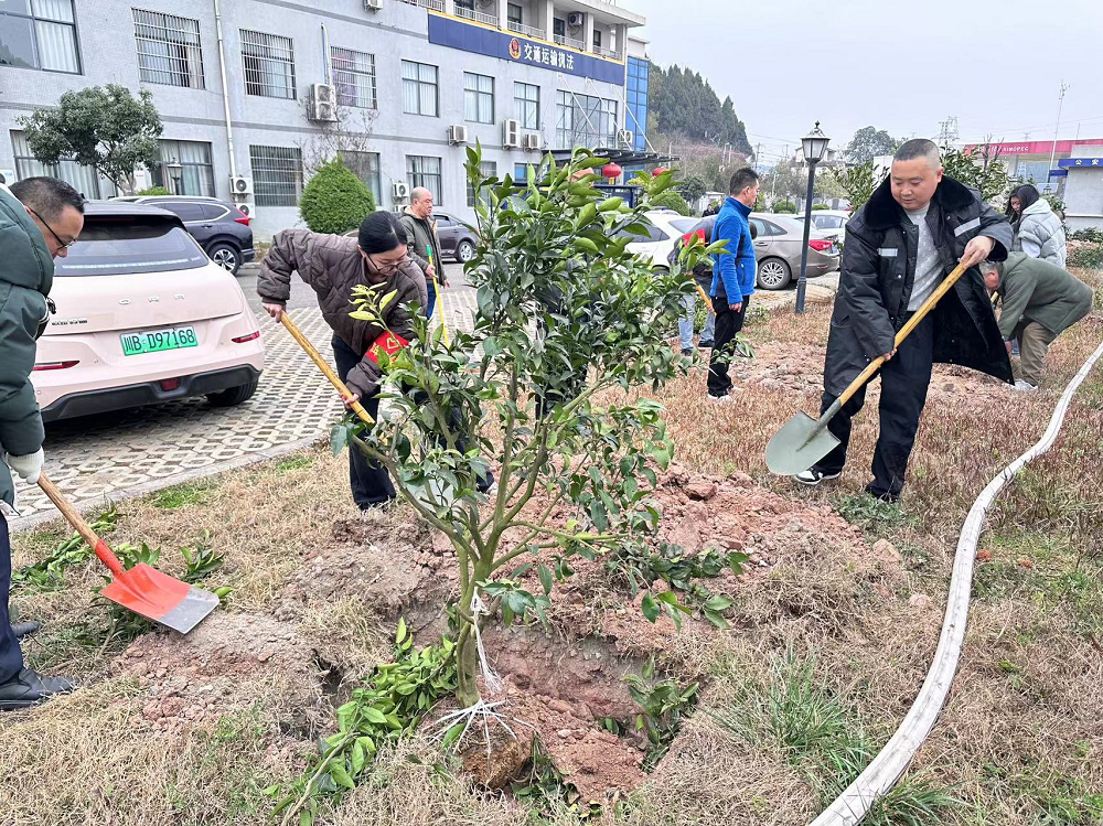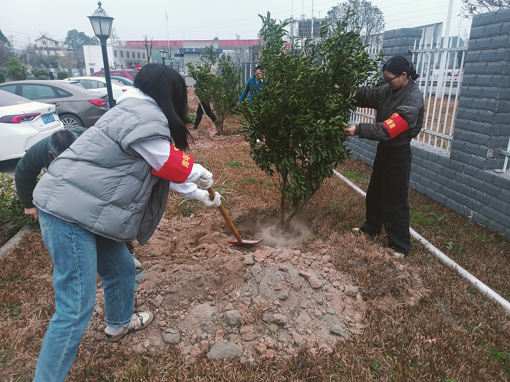 在植樹現(xiàn)場(chǎng),大家三五一組,揮鍬鏟土、扶苗填坑、各司其職,合力栽下了一株株樹苗,處處呈現(xiàn)出一派熱火朝天的忙碌景象。經(jīng)過一上午的辛勤勞動(dòng),30多株柑橘、金桔等樹苗在自己的屬地“安家落戶”,把原本一片空草地裝點(diǎn)的生機(jī)盎然,形成了一道亮麗的風(fēng)景線。