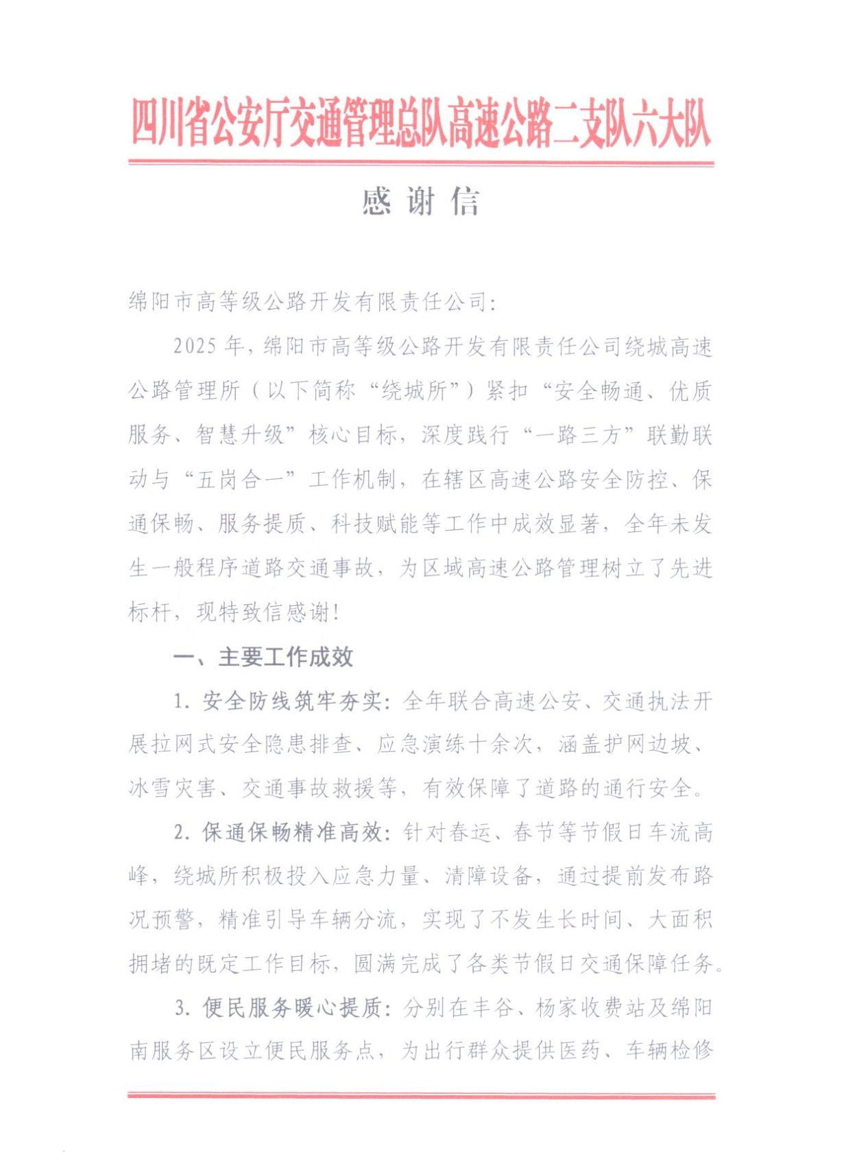 1月15日,高開(kāi)司收到來(lái)自四川省公安廳交通管理總隊(duì)高速公路二支隊(duì)六大隊(duì)的一封感謝信。信中對(duì)高開(kāi)司繞城高速2025年度“安全暢通、優(yōu)質(zhì)服務(wù)、智慧升級(jí)”核心目標(biāo),深度踐行“一路三方”聯(lián)勤聯(lián)動(dòng)與“五崗合一”工作機(jī)制,在轄區(qū)高速公路安全防控、保通保暢、服務(wù)提質(zhì)、科技賦能等工作中成效顯著,全年未發(fā)生一般程序道路交通事故,為區(qū)域高速公路管理樹(shù)立了先進(jìn)標(biāo)桿,給予高度贊譽(yù),對(duì)公司與高速公安攜手筑牢道路安全防線、全力保障公眾出行順暢的堅(jiān)實(shí)舉措表達(dá)誠(chéng)摯謝意,字里行間滿含認(rèn)可與期許。